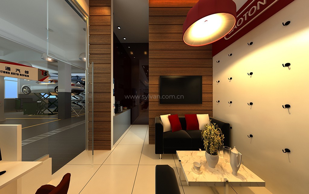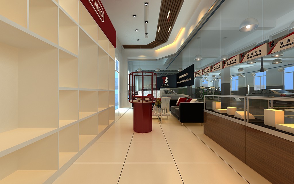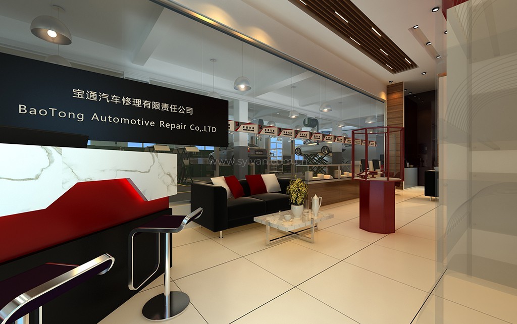 汽车修理厂门头设计、汽车修理厂接待大厅设计、汽车修理厂客户休息区、展区及配件区设计。