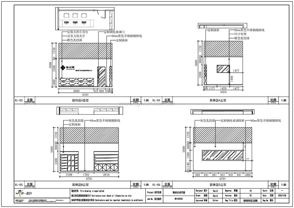 海南车大师高端汽车维修护理中心设计案例效果图 项目简介 项目面积:1300平方米 项目地点:海南陵水 项目简介:海南车大师高端汽车维修护理中心位于陵水度假区内,园区内车辆普遍比较高端,所以对与车辆维修要求也比较高,因此在对于店面整体的设计和维修流程都必须按照高标准要求,在设计的过程中力求效果高端大气的同时兼顾落地性和环保性,让人们在修车的同时尽可能感受到店面的人性化和舒适性,完美达到甲方的设计要求。 项目内容:汽修厂外观设计、汽修厂接待设计、汽修厂车间布局规划、全套施工图,设备供应。 设计周期:15天 设计概要 1300㎡ 项目面积 1230㎡ 车间面积 70㎡ 接待及客休 15天 设计工期 接待区效果图 施工图