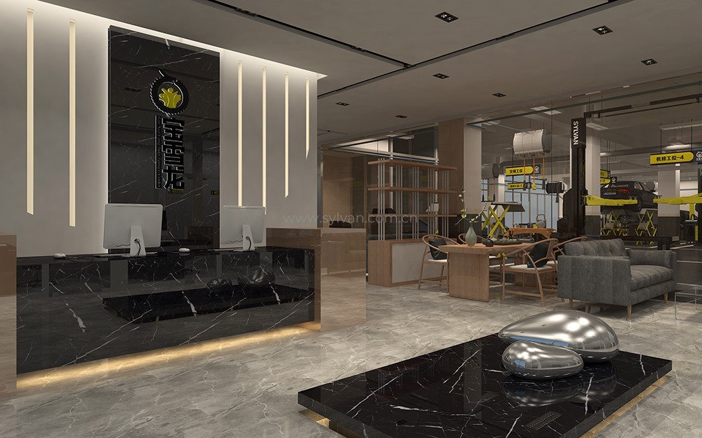 汽车修理厂门头设计、汽车修理厂接待大厅设计、汽车修理厂客户休息区、展区及配件区设计。